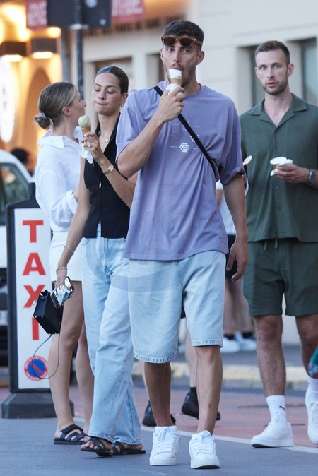 Exclusif - Kai Havertz (joueur de foot de l'équipe nationale allemande et de Chelsea) et sa compagne Sofia Weber mangent une glace en se baladant avec des amis sur le port de Saint-Tropez, le 11 juillet 2024. Exclusive - Germany call for price - Kai Havertz (soccer player for the German national team and Chelsea) and his partner Sofia Weber eat an ice cream while walking with friends on the port of Saint-Tropez, July 11, 2024 .