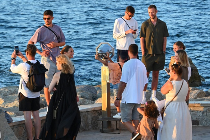 Exclusif - Kai Havertz (joueur de foot de l'équipe nationale allemande et de Chelsea) et sa compagne Sofia Weber mangent une glace en se baladant avec des amis sur le port de Saint-Tropez, le 11 juillet 2024. Exclusive - Germany call for price - Kai Havertz (soccer player for the German national team and Chelsea) and his partner Sofia Weber eat an ice cream while walking with friends on the port of Saint-Tropez, July 11, 2024 .