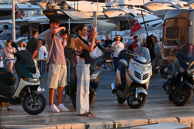 Exclusif - Kai Havertz (joueur de foot de l'équipe nationale allemande et de Chelsea) et sa compagne Sofia Weber mangent une glace en se baladant avec des amis sur le port de Saint-Tropez, le 11 juillet 2024. Exclusive - Germany call for price - Kai Havertz (soccer player for the German national team and Chelsea) and his partner Sofia Weber eat an ice cream while walking with friends on the port of Saint-Tropez, July 11, 2024 .