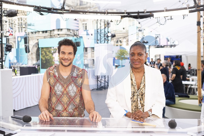 Exclusif - Amir et Marie-Jose Perec - Le plateau en direct sur France 2 pour faire le relais avec la flamme olympique qui traverse Paris - Backstage du "Concert de Paris" sur le parvis de l'hôtel de ville de Paris retransmis en direct sur France 2 et sur France Inter, Paris le 14 juillet 2024. © Christophe Clovis- Pierre Perusseau / Bestimage Exclusive - For Germany call for price - No Web For Belgium and Switzerland - Backstage of the "Concert de Paris" on the forecourt of Paris City Hall broadcast live on France 2 and France Inter, Paris on July 14, 2024.