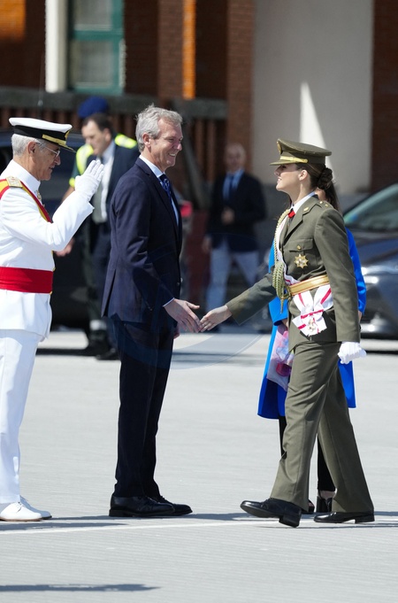 King Felipe VI (Le roi Felipe VI d'Espagne), Queen Letizia (La reine Letizia d'Espagne) and Crown Princess Leonor (La princesse Leonor) attend the delivery of Royal offices of employment at the Naval Military School on July 16, 2024 in Marin, Spain. © Lalo Yasky/Bestimage
