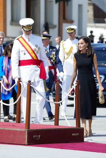 Król Felipe VI, królowa Hiszpanii Letycja i księżniczka Leonor podczas ceremonii przekazania zwolnień królewskich nowym oficerom Marynarki Wojennej w Marín