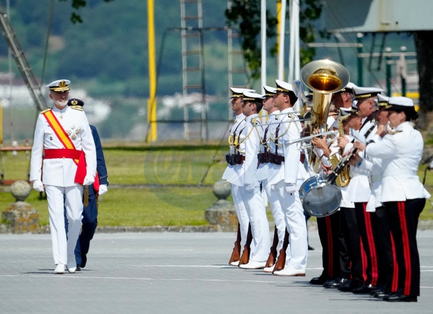 King Felipe VI (Le roi Felipe VI d'Espagne), Queen Letizia (La reine Letizia d'Espagne) and Crown Princess Leonor (La princesse Leonor) attend the delivery of Royal offices of employment at the Naval Military School on July 16, 2024 in Marin, Spain. © Lalo Yasky/Bestimage