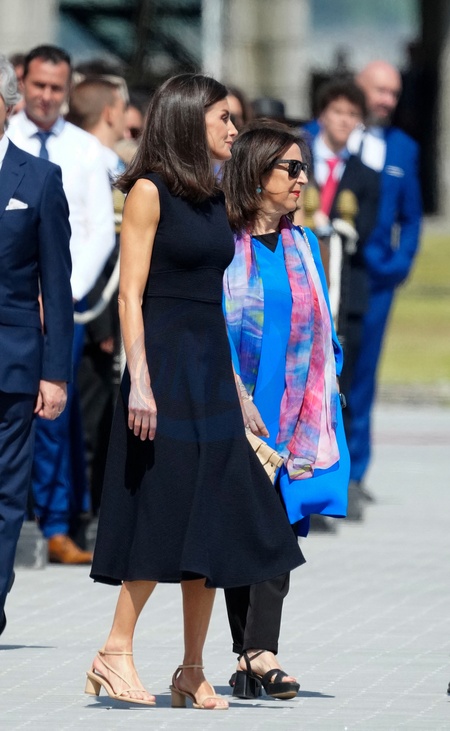 Król Felipe VI, królowa Hiszpanii Letycja i księżniczka Leonor podczas ceremonii przekazania zwolnień królewskich nowym oficerom Marynarki Wojennej w Marín