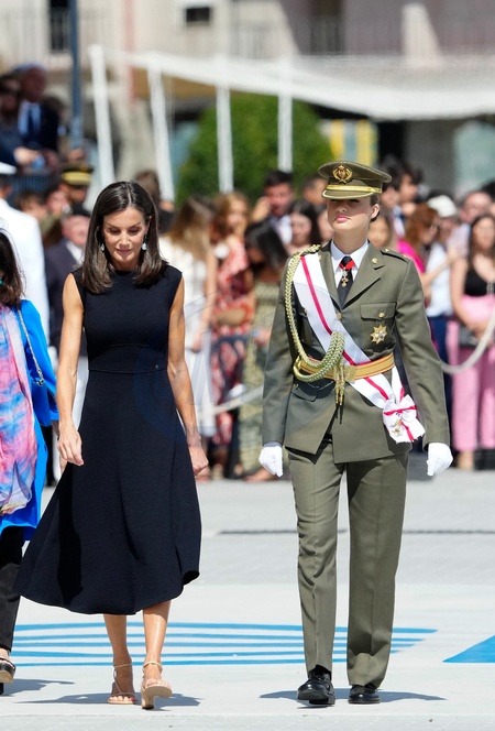 Le roi Felipe VI, la reine Letizia d’Espagne et la princesse Leonor lors de la cérémonie de remise des destitutions royales aux nouveaux officiers de la Marine à Marín