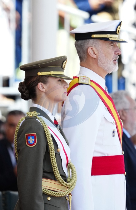King Felipe VI (Le roi Felipe VI d'Espagne), Queen Letizia (La reine Letizia d'Espagne) and Crown Princess Leonor (La princesse Leonor) attend the delivery of Royal offices of employment at the Naval Military School on July 16, 2024 in Marin, Spain. © Lalo Yasky/Bestimage