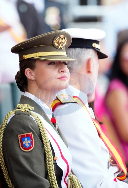King Felipe VI (Le roi Felipe VI d'Espagne), Queen Letizia (La reine Letizia d'Espagne) and Crown Princess Leonor (La princesse Leonor) attend the delivery of Royal offices of employment at the Naval Military School on July 16, 2024 in Marin, Spain. © Lalo Yasky/Bestimage
