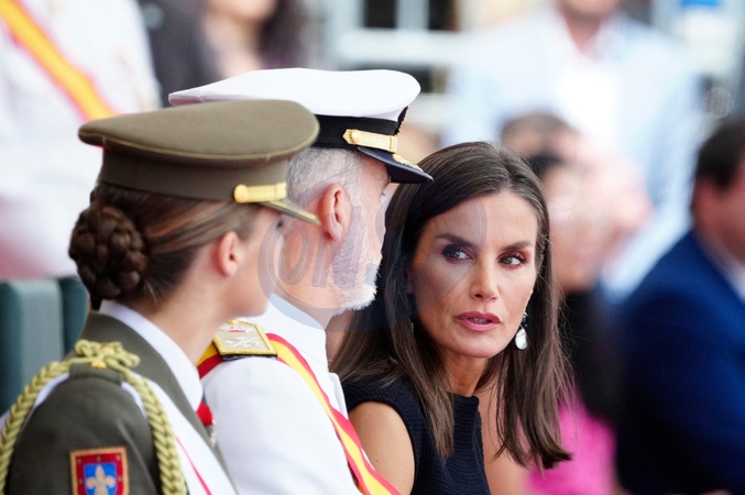 King Felipe VI (Le roi Felipe VI d'Espagne), Queen Letizia (La reine Letizia d'Espagne) and Crown Princess Leonor (La princesse Leonor) attend the delivery of Royal offices of employment at the Naval Military School on July 16, 2024 in Marin, Spain. © Lalo Yasky/Bestimage