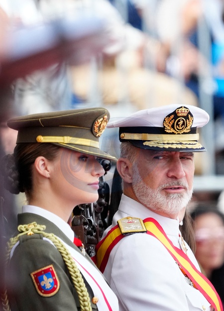 King Felipe VI (Le roi Felipe VI d'Espagne), Queen Letizia (La reine Letizia d'Espagne) and Crown Princess Leonor (La princesse Leonor) attend the delivery of Royal offices of employment at the Naval Military School on July 16, 2024 in Marin, Spain. © Lalo Yasky/Bestimage