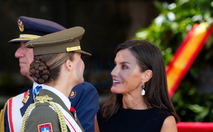 King Felipe VI (Le roi Felipe VI d'Espagne), Queen Letizia (La reine Letizia d'Espagne) and Crown Princess Leonor (La princesse Leonor) attend the delivery of Royal offices of employment at the Naval Military School on July 16, 2024 in Marin, Spain. © Lalo Yasky/Bestimage
