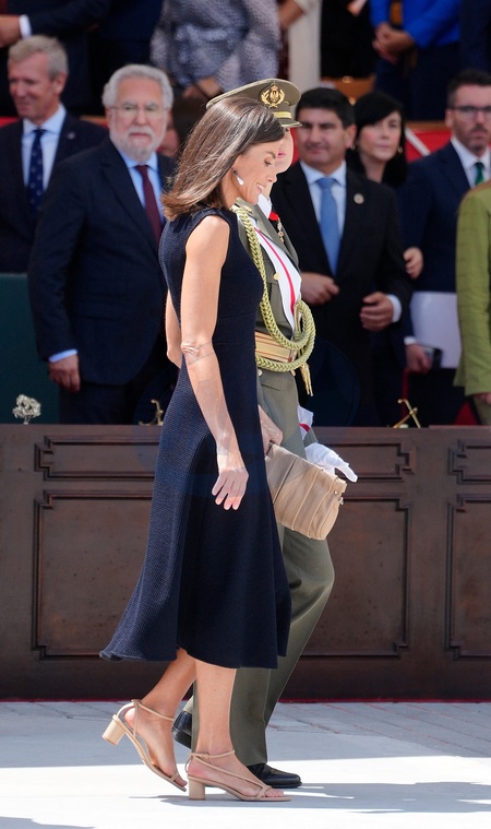 Le roi Felipe VI, la reine Letizia d’Espagne et la princesse Leonor lors de la cérémonie de remise des destitutions royales aux nouveaux officiers de la Marine à Marín