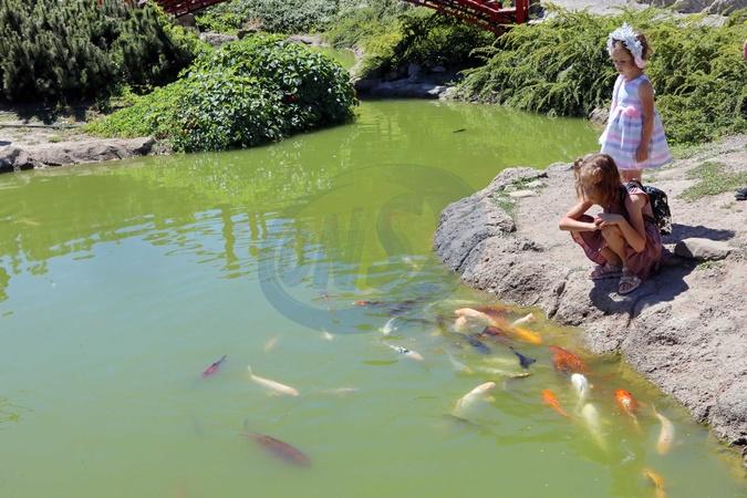 UMAN, UKRAINE - JULY 6, 2024 - Two girls look at koi fish swimming in a pond at the Sofiivka National Dendrological Park, Uman, Cherkasy region, central Ukraine., Credit:Volodymyr Tarasov / Avalon