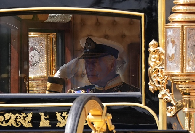 King Charles III salutes the Life Guards as he and Queen Camilla depart Buckingham Palace, London, in the Diamond Jubilee State Coach as they head to the State Opening of Parliament in the House of Lords at the Palace of Westminster, London. Picture date: Wednesday July 17, 2024. PA Photo. See PA story POLITICS Speech. Photo credit should read: Andrew, Credit:Andrew Matthews / Avalon