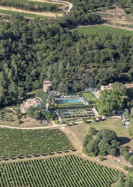 Widok z lotu ptaka na Chateau Margui, hotel i posiadłość winiarską George'a Lucasa w gminie Chateauvert, departament Var