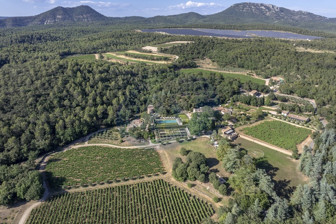 Widok z lotu ptaka na Chateau Margui, hotel i posiadłość winiarską George'a Lucasa w gminie Chateauvert, departament Var