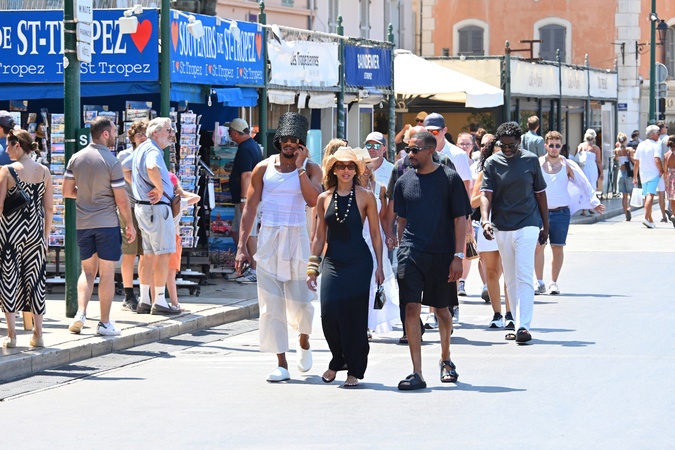 Steve Harvey avec sa femme Marjorie Bridges avec leurs enfants Wynton, Lori Harvey et Broderick Harvey Jr. se baladent en famille dans les rues de Saint-Tropez, Côte d'Azur, France, le 18 juillet 2024. Steve Harvey with his wife Marjorie Bridges with their children Wynton, Lori Harvey and Broderick Harvey Jr. take a family stroll in the streets of Saint-Tropez, French Riviera, France, on July 18, 2024.