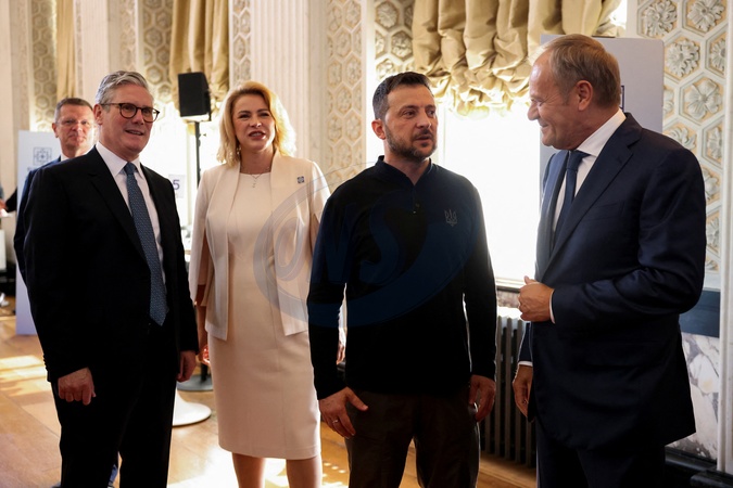 Poland's Prime Minister Donald Tusk talks to Ukrainian President Volodymyr Zelenskiy next to Britain's Prime Minister Keir Starmer during the European Political Community meeting at Blenheim Palace, near Oxford, Britain July 18, 2024., Credit:Hollie Adams / Avalon