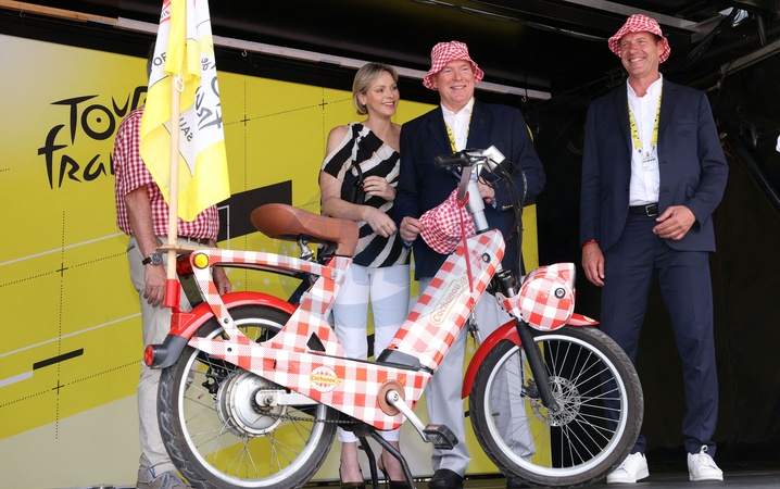 Le Prince Albert et la Princesse Charlène de Monaco, Christian Prudhomme (directeur du Tour de France) - Le prince Albert II de Monaco et la princesse Charlene ont reçu un cadeau insolite : un Solex éléctrique aux couleurs de la célébre marque Cochonou. La marque aux couleurs Rouge et Blanche et ses fameux "bob" on séduit la princesse qui s'en est amusé en couvrant son mari avec dans un fou rire partagé. - Le prince Albert II de Monaco et la princesse Charlene ont donné le départ de la dernière étape du Tour de France 2024, un contre la montre entre Monaco et Nice en compagnie de Christian Estrosi, le maire de Nice, sa femme, Laura Tenoudji et Christian Prudhomme, le directeur du Tour de France, le 21 juillet 2024. Ce Tour est remporté pour la troisième fois par le Slovène Tadej Pogačar, UAE Team Emirates avec une sixième victoire d'étape, en s'imposant au contre-la-montre final. © Claudia Albuquerque/Bestimage Prince Albert II of Monaco and Princess Charlene received an unusual gift: an electric Solex in the colors of the famous Cochonou brand. The brand with its red and white colors and its famous "bob" caps won over the princess, who had fun covering her husband with it in a shared fit of laughter - Prince Albert II of Monaco and Princess Charlene gave the start to the final stage of the 2024 Tour de France, a time trial between Monaco and Nice in the company of Christian Estrosi, the mayor of Nice, his wife, Laura Tenoudji and Christian Prudhomme, the director of the Tour de France, on July 21, 2024. This Tour is won for the third time by the Slovenian Tadej Pogačar, UAE Team Emirates with a sixth stage victory, by winning the final time trial.
