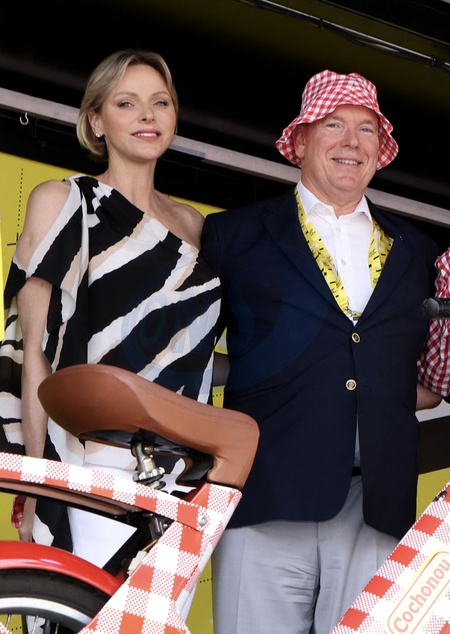Le prince Albert II de Monaco et la princesse Charlene - Le prince Albert II de Monaco et la princesse Charlene ont reçu un cadeau insolite : un Solex éléctrique aux couleurs de la célébre marque Cochonou. La marque aux couleurs Rouge et Blanche et ses fameux "bob" on séduit la princesse qui s'en est amusé en couvrant son mari avec dans un fou rire partagé. - Le prince Albert II de Monaco et la princesse Charlene ont donné le départ de la dernière étape du Tour de France 2024, un contre la montre entre Monaco et Nice en compagnie de Christian Estrosi, le maire de Nice, sa femme, Laura Tenoudji et Christian Prudhomme, le directeur du Tour de France, le 21 juillet 2024. Ce Tour est remporté pour la troisième fois par le Slovène Tadej Pogačar, UAE Team Emirates avec une sixième victoire d'étape, en s'imposant au contre-la-montre final. © Claudia Albuquerque/Bestimage Prince Albert II of Monaco and Princess Charlene received an unusual gift: an electric Solex in the colors of the famous Cochonou brand. The brand with its red and white colors and its famous "bob" caps won over the princess, who had fun covering her husband with it in a shared fit of laughter - Prince Albert II of Monaco and Princess Charlene gave the start to the final stage of the 2024 Tour de France, a time trial between Monaco and Nice in the company of Christian Estrosi, the mayor of Nice, his wife, Laura Tenoudji and Christian Prudhomme, the director of the Tour de France, on July 21, 2024. This Tour is won for the third time by the Slovenian Tadej Pogačar, UAE Team Emirates with a sixth stage victory, by winning the final time trial.