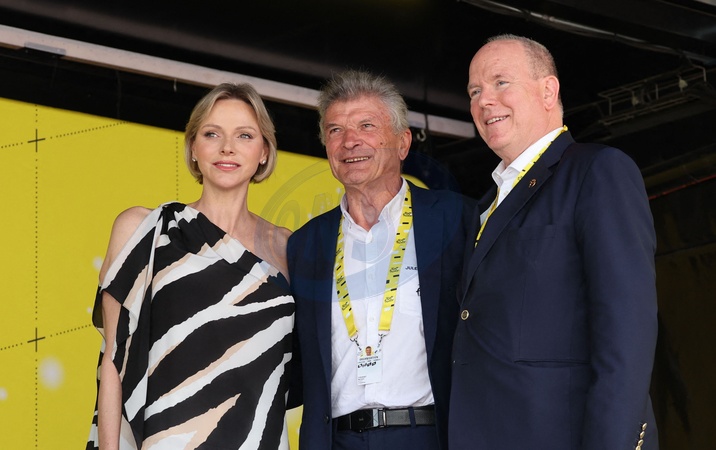 Le prince Albert II de Monaco et la princesse Charlene, Bernard Thévenet - Le prince Albert II de Monaco et la princesse Charlene ont donné le départ de la dernière étape du Tour de France 2024, un contre la montre entre Monaco et Nice en compagnie de Christian Estrosi, le maire de Nice, sa femme, Laura Tenoudji et Christian Prudhomme, le directeur du Tour de France, le 21 juillet 2024. Ce Tour est remporté pour la troisième fois par le Slovène Tadej Pogačar, UAE Team Emirates avec une sixième victoire d'étape, en s'imposant au contre-la-montre final. © Claudia Albuquerque/Bestimage Prince Albert II of Monaco and Princess Charlene received an unusual gift: an electric Solex in the colors of the famous Cochonou brand. The brand with its red and white colors and its famous "bob" caps won over the princess, who had fun covering her husband with it in a shared fit of laughter - Prince Albert II of Monaco and Princess Charlene gave the start to the final stage of the 2024 Tour de France, a time trial between Monaco and Nice in the company of Christian Estrosi, the mayor of Nice, his wife, Laura Tenoudji and Christian Prudhomme, the director of the Tour de France, on July 21, 2024. This Tour is won for the third time by the Slovenian Tadej Pogačar, UAE Team Emirates with a sixth stage victory, by winning the final time trial.