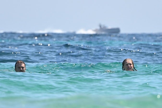 Exclusif - Prix Spécial - No Web - Toni Garrn et son nouveau compagnon Joshua Phitoussi se baignent en amoureux sur une plage de Saint-Tropez le 20 juillet 2024. Exclusive - For Germany call for price - No Web - Toni Garrn and her new companion Joshua Phitoussi take a romantic swim on a beach in Saint-Tropez on July 20, 2024.