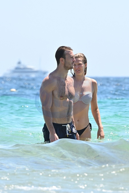 Exclusif - Prix Spécial - No Web - Toni Garrn et son nouveau compagnon Joshua Phitoussi se baignent en amoureux sur une plage de Saint-Tropez le 20 juillet 2024. Exclusive - For Germany call for price - No Web - Toni Garrn and her new companion Joshua Phitoussi take a romantic swim on a beach in Saint-Tropez on July 20, 2024.