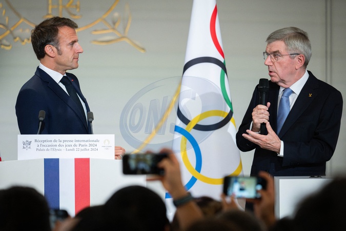 Emmanuel Macron, président de la République avec Thomas Bach, président du Comite International Olympique, CIO lors de réception de la presse internationale au palais présidentiel de l'Elysée, à l'occasion des jeux olympiques et paralympiques de Paris 2024, à Paris, France, le 22 juillet 2024. © Eric Tschaen/Pool/Bestimage French President and International Olympic Committee (IOC) President during a reception for international journalists accredited for the Paris 2024 Olympic Games at the Elysee Presidential Palace, in Paris, France, on July 22, 2024, ahead of Paris 2024 Olympic and Paralympic games.