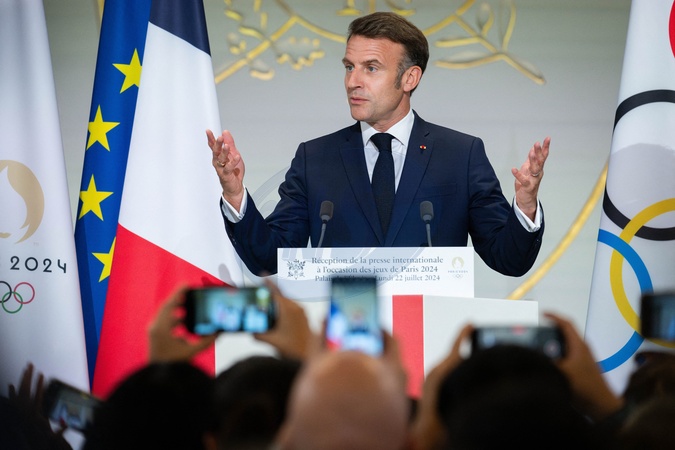 Discours d'Emmanuel Macron, président de la République lors de réception de la presse internationale au palais présidentiel de l'Elysée, à l'occasion des jeux olympiques et paralympiques de Paris 2024, à Paris, France, le 22 juillet 2024. © Eric Tschaen/Pool/Bestimage French President and International Olympic Committee (IOC) President during a reception for international journalists accredited for the Paris 2024 Olympic Games at the Elysee Presidential Palace, in Paris, France, on July 22, 2024, ahead of Paris 2024 Olympic and Paralympic games.