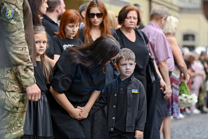 LVIV, UKRAINE - JULY 21, 2024 - Daughter Sofiia Semchyshyn and her children Yeva and Dmytro attend the memorial service for their mother and grandmother, linguistic professor and former MP Iryna Farion, who was shot dead on the street on July 19, at the Saints Peter and Paul Garrison Church, Lviv, western Ukraine., Credit:Anastasiia Smolienko / Avalon