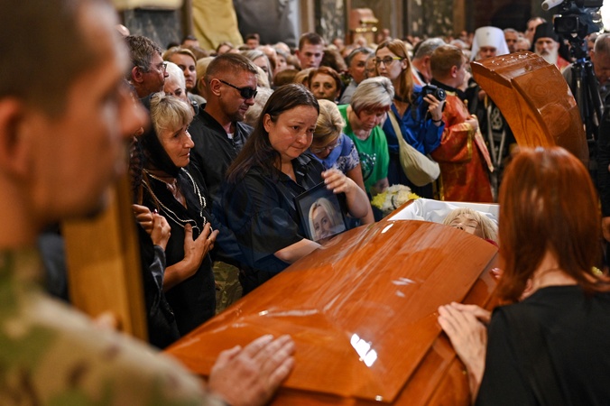 LVIV, UKRAINE - JULY 21, 2024 - Daughter Sofiia Semchyshyn holds the photo of her mother, linguistic professor and former MP Iryna Farion, who was shot dead on the street on July 19, during the memorial service at the Saints Peter and Paul Garrison Church, Lviv, western Ukraine., Credit:Anastasiia Smolienko / Avalon