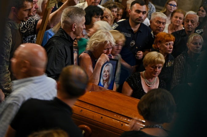 LVIV, UKRAINE - JULY 21, 2024 - A woman holds a photo of linguistic professor and former MP Iryna Farion, who was shot dead on the street on July 19, during the memorial service at the Saints Peter and Paul Garrison Church, Lviv, western Ukraine., Credit:Anastasiia Smolienko / Avalon