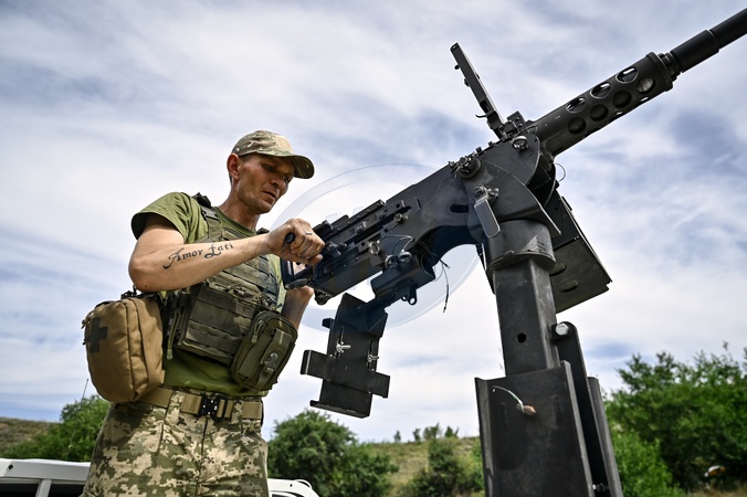 ZAPORIZHZHIA REGION, UKRAINE - JULY 10, 2024 - A fighter of the Separate Anti-Aircraft Machine Gun Battalion, who provides air cover for the unmanned aerial vehicles and destroys targets at a distance of up to 1,500 metres, practices shooting from a Browning heavy machine gun, Zaporizhzhia region, southeastern Ukraine, Credit:Dmytro Smolienko / Avalon