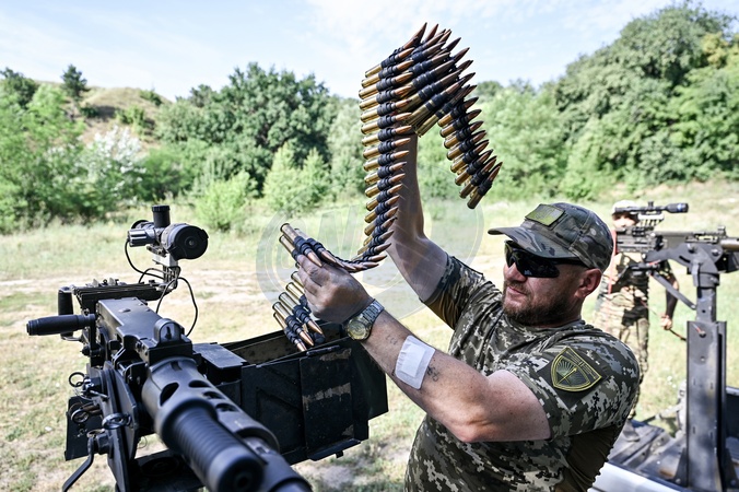 ZAPORIZHZHIA REGION, UKRAINE - JULY 10, 2024 - A fighter of the Separate Anti-Aircraft Machine Gun Battalion, who provides air cover for the unmanned aerial vehicles and destroys targets at a distance of up to 1,500 metres, practices shooting from a Browning heavy machine gun, Zaporizhzhia region, southeastern Ukraine, Credit:Dmytro Smolienko / Avalon