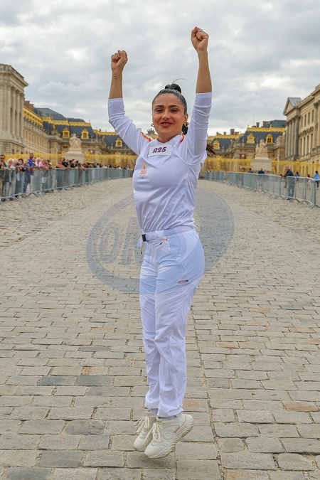 Salma Hayek porteuse de la flamme olympique des Jeux Olympiques de Paris 2024 (JO) au château de Versailles dans les Yvelines, France, le 23 juillet 2024. © Dominique Jacovides/Bestimage Salma Hayek carrying the Olympic flame for the Paris 2024 Olympic Games (Olympics) at the Versailles Palace, Yvelines, France, on July 23, 2024.