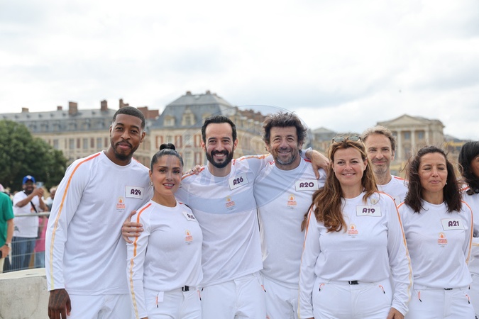 Salma Hayek et Patrick Bruel porteurs de la flamme olympique des Jeux Olympiques de Paris 2024 (JO) au château de Versailles dans les Yvelines, France, le 23 juillet 2024. © Dominique Jacovides/Bestimage Salma Hayek carrying the Olympic flame for the Paris 2024 Olympic Games (Olympics) at the Versailles Palace, Yvelines, France, on July 23, 2024.