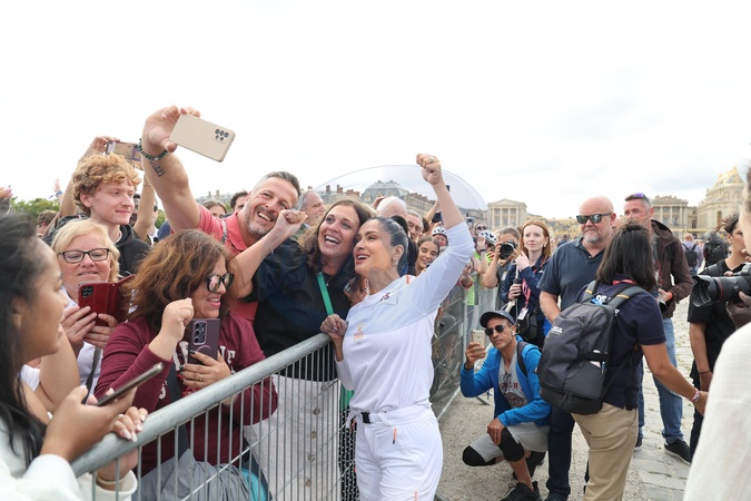 Salma Hayek porteuse de la flamme olympique des Jeux Olympiques de Paris 2024 (JO) au château de Versailles dans les Yvelines