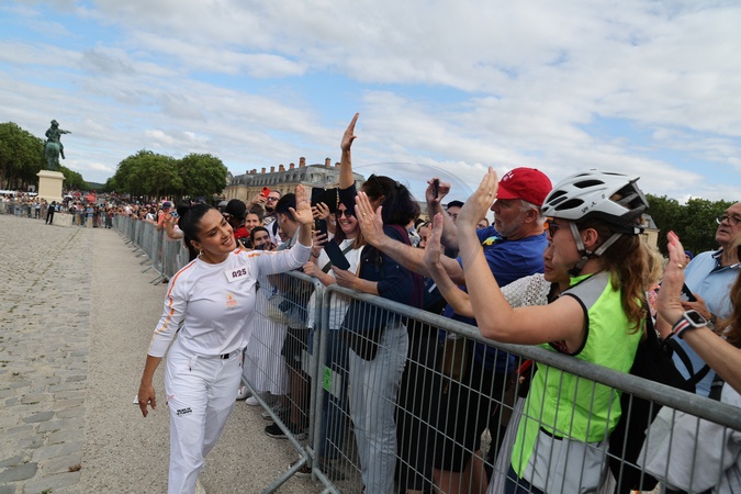 Salma Hayek porteuse de la flamme olympique des Jeux Olympiques de Paris 2024 (JO) au château de Versailles dans les Yvelines