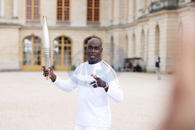 Steve Toussaint porteur de la flamme olympique des Jeux Olympiques de Paris 2024 (JO) au château de Versailles dans les Yvelines, France, le 23 juillet 2024. © Dominique Jacovides/Bestimage