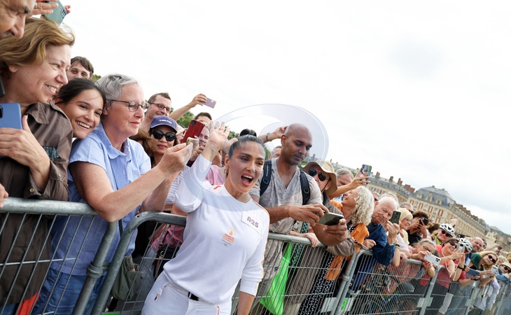 Salma Hayek et Patrick Bruel portent la flamme olympique des Jeux Olympiques de Paris 2024 (JO) au château de Versailles