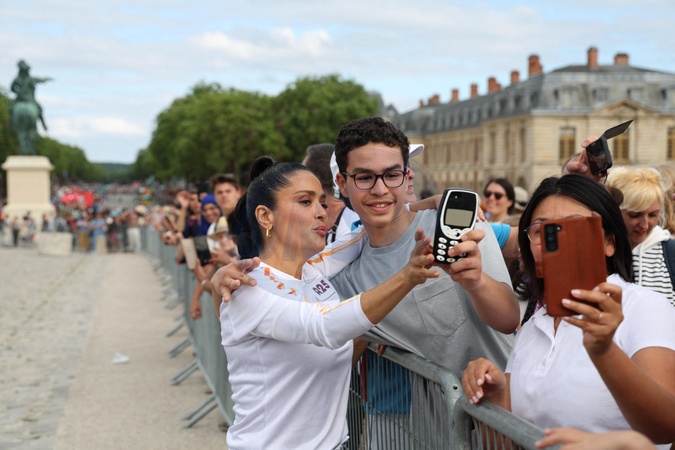 Salma Hayek porteuse de la flamme olympique des Jeux Olympiques de Paris 2024 (JO) au château de Versailles dans les Yvelines, France, le 23 juillet 2024. © Dominique Jacovides/Bestimage Salma Hayek carrying the Olympic flame for the Paris 2024 Olympic Games (Olympics) at the Versailles Palace, Yvelines, France, on July 23, 2024.