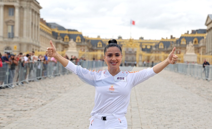 Salma Hayek porteuse de la flamme olympique des Jeux Olympiques de Paris 2024 (JO) au château de Versailles dans les Yvelines, France, le 23 juillet 2024. © Dominique Jacovides/Bestimage Salma Hayek carrying the Olympic flame for the Paris 2024 Olympic Games (Olympics) at the Versailles Palace, Yvelines, France, on July 23, 2024.