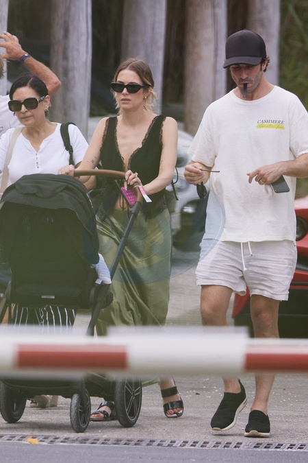 Exclusif - Ashley Benson et son mari Brandon Davis avec leur fille Aspen Davis (en poussette) à la sortie du Club 55 à Saint-Tropez, Côte d'Azur, France, le 21 juillet 2024. No Web pour la Belgique et la Suisse Exclusive - For Germany Call For Price - Ashley Benson and her husband Brandon Davis with their daughter Aspen Davis (in stroller) leaving Club 55 in Saint-Tropez, French Riviera, France, on July 21, 2024.