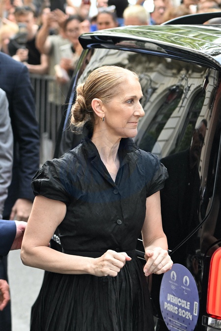 Céline Dion à la sortie de l'hôtel Royal Monceau à Paris avant l'ouverture des Jeux Olympiques (JO) de Paris 2024, à Paris, France, le 24 juillet 2024. Céline Dion leaving the Royal Monceau hotel in Paris before the opening of the Paris 2024 Olympic Games (JO), in Paris, France, July 24, 2024.