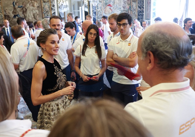 Le roi Felipe VI et la reine Letizia d'Espagne lors de la réception de l'équipe olympique espagnole à l'ambassade d'Espagne à Paris, à l'occasion des Jeux Olympiques Paris 2024. Le 25 juillet 2024 © Casa de S.M. El Rey via Bestimage King Felipe VI and Queen Letizia (wearing Dior Collection Haute Couture Printemps/Eté 2024) receive spanish olympic teams members at the Spanish Embassy in Paris. July 25, 2024.