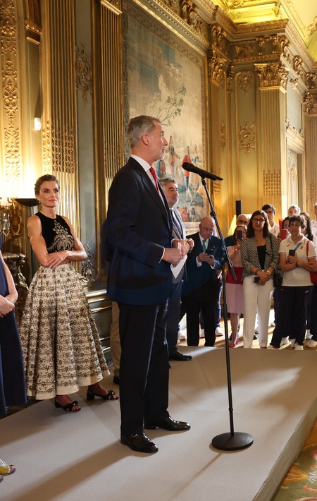 Król Hiszpanii Felipe VI i królowa Hiszpanii Letizia podczas przyjęcia hiszpańskiej drużyny olimpijskiej w Ambasadzie Hiszpanii w Paryżu z okazji Igrzysk Olimpijskich Paryż 2024