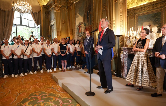 Le roi Felipe VI et la reine Letizia d'Espagne lors de la réception de l'équipe olympique espagnole à l'ambassade d'Espagne à Paris, à l'occasion des Jeux Olympiques Paris 2024. Le 25 juillet 2024 © Casa de S.M. El Rey via Bestimage King Felipe VI and Queen Letizia (wearing Dior Collection Haute Couture Printemps/Eté 2024) receive spanish olympic teams members at the Spanish Embassy in Paris. July 25, 2024.