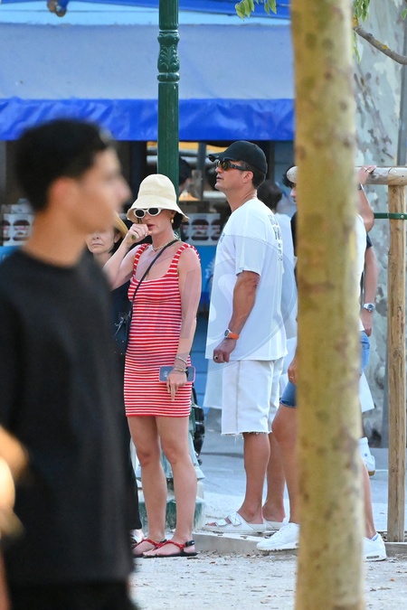 Semi-Exclusif - No Web - Katy Perry et son fiancé Orlando Bloom avec leur fille Daisy se baladent sur le port de Saint-Tropez, le 14 juillet 2024. Merci de flouter le visage des enfants avant publication Semi-Exclusive - No Web - Katy Perry and her fiancé Orlando Bloom with their daughter Daisy stroll on the port of Saint-Tropez, July 14, 2024.