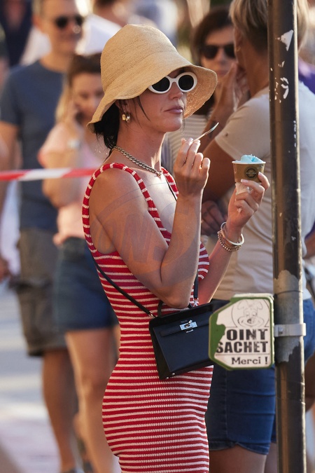 Semi-Exclusif - No Web - Katy Perry et son fiancé Orlando Bloom avec leur fille Daisy se baladent sur le port de Saint-Tropez, le 14 juillet 2024. Merci de flouter le visage des enfants avant publication Semi-Exclusive - No Web - Katy Perry and her fiancé Orlando Bloom with their daughter Daisy stroll on the port of Saint-Tropez, July 14, 2024.
