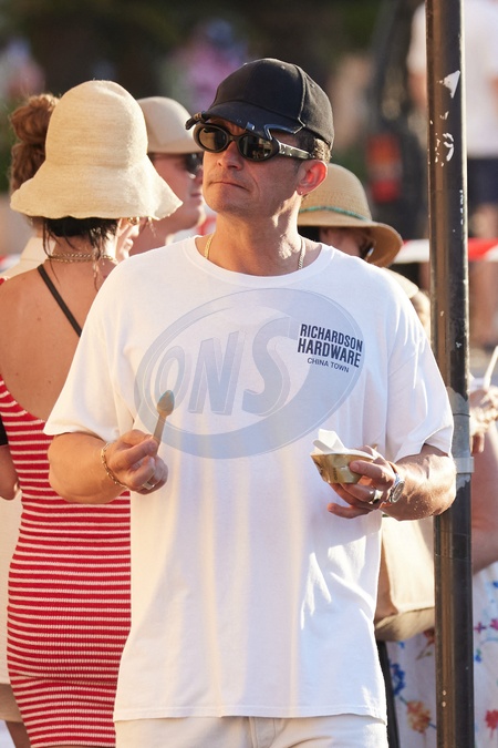 Semi-Exclusif - No Web - Katy Perry et son fiancé Orlando Bloom avec leur fille Daisy se baladent sur le port de Saint-Tropez, le 14 juillet 2024. Merci de flouter le visage des enfants avant publication Semi-Exclusive - No Web - Katy Perry and her fiancé Orlando Bloom with their daughter Daisy stroll on the port of Saint-Tropez, July 14, 2024.