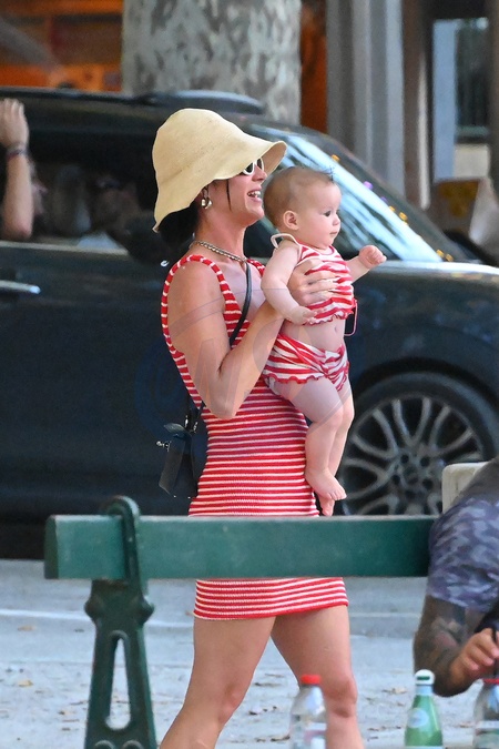 Semi-Exclusif - No Web - Katy Perry et son fiancé Orlando Bloom avec leur fille Daisy se baladent sur le port de Saint-Tropez, le 14 juillet 2024. Merci de flouter le visage des enfants avant publication Semi-Exclusive - No Web - Katy Perry and her fiancé Orlando Bloom with their daughter Daisy stroll on the port of Saint-Tropez, July 14, 2024.
